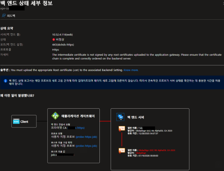 상기 화면은 백엔드 상태에서 확인시 백엔드 서버에 올라가있는 인증서와 AppGW에 적용 된 인증서간 인증이 되지 않아 통신에 실패했다는 내용을 담고 있습니다.