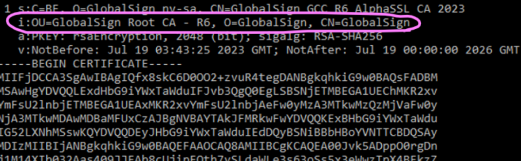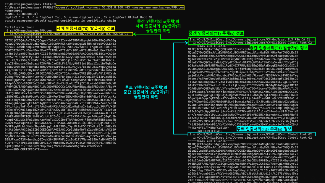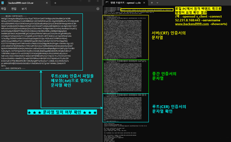 -> Windows 에서 openssl 설치 후, 백엔드 서버쪽(체인 CRT 인증서)으로 openssl 응답을 받아온 다음, 루트(CER)인증서 문자열 부분 확인