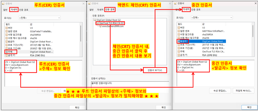 -> 아래 예시와 같이, 루트인증서 -> 중간인증서 -> 서버인증서 방향으로, 체인 구성 확인