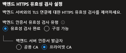 검증 결과 AppGW의 백엔드 인증서 유효성 검사 유형이 프라이빗 CA를 선택한 상황에서, AppGW에 업로드 된 인증서는 모든 단계의 체인 인증서가 잘 담겨있는 Full Chain 인증서였으나 백엔드 서버에 바인딩 된 인증서가 중간 Chain인증서가 없는 인증서라서 인증서 검증이 되지 않아 발생한 이슈로 최종 확인 하였습니다.