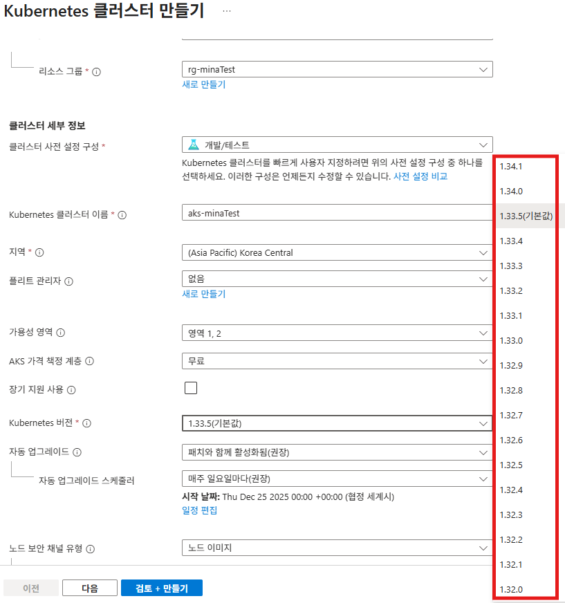 하지만 Azure Portal 에서 AKS 클러스터를 생성할 때 선택 할 수 있는 버전은 최근 버전만 선택 할 수 있도록 되어 있습니다.
