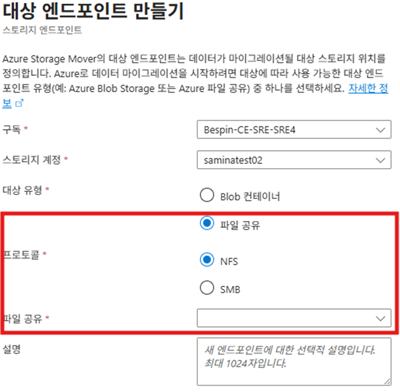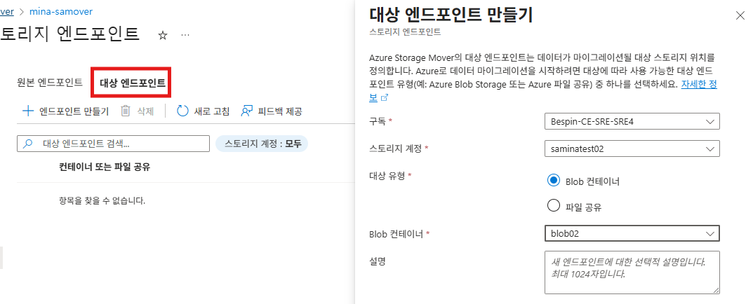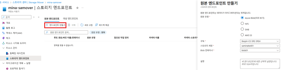 생성 된 Storage Mover 리소스 관리-스토리지 엔드포인트-원본 엔드포인트 탭-엔드포인트 만들기 순서로 클릭하여 원본 엔드포인트 만들기 창을 엽니다.