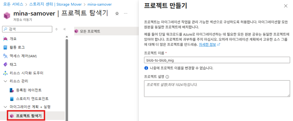 Storage Mover 인스턴스의 프로젝트 탐색기 탭으로 이동하여 프로젝트 만들기를 선택합니다.